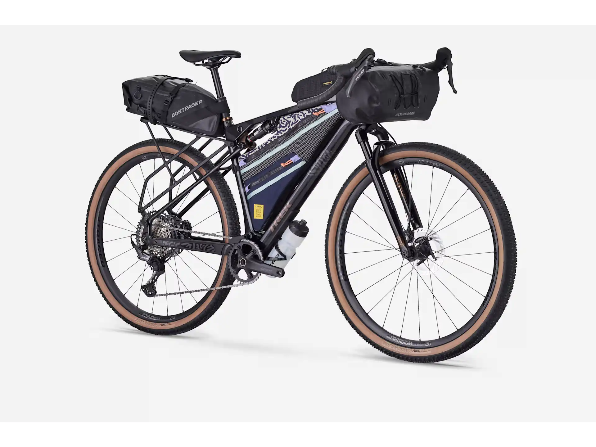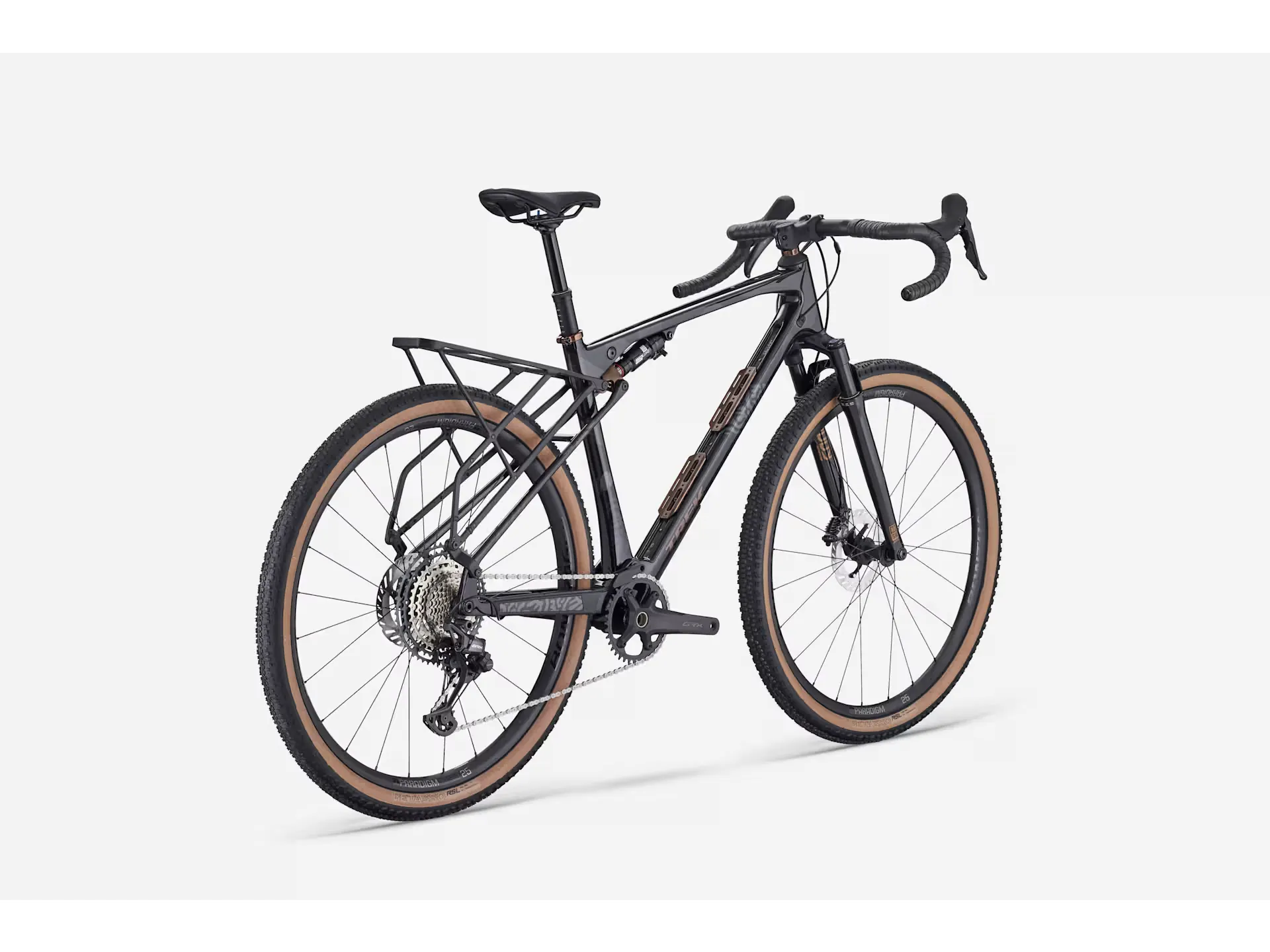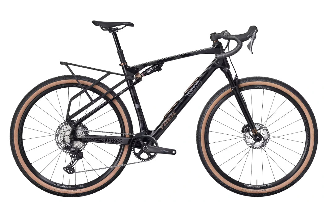is an adventure-ready full-suspension gravel bike for getting far, far out there. Its carbon frame delivers 55 mm of rear travel from a RockShox SIDluxe IsoStrut shock, while a RockShox Rudy XL fork smooths rowdy roads and trails with 60 mm of travel. It comes ready to explore with Bontrager Paradigm Comp wheels, a 12-speed Shimano GRX drivetrain and TranzX dropper post.
